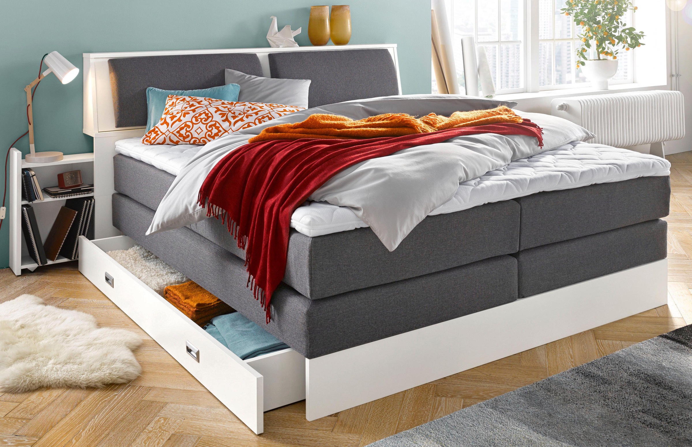 Hoch zu niedrig sort by sales rank. Weitere ideen zu boxspringbett, bett, springen. Breckle boxspringbett, inklusive ausziehregale am kopfteil. Breckle boxspringbett, kopfteil in kissenoptik. Bettkasten und topper, grau, struktur (100% polyester).